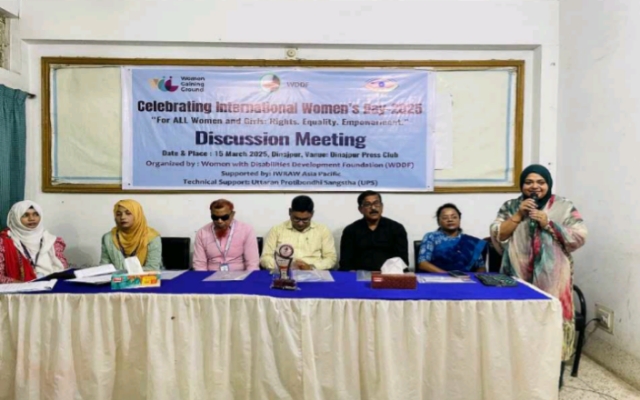 অধিকার, সমতা, ক্ষমতায়ন, নারী ও কন্যার উন্নয়ন-এবারের আন্তর্জাতিক নারী দিবস,২০২৫ এর প্রতিপাদ্যকে সামনে রেখে ১৫ মার্চ,২০২৫ইং সকাল ১০.৩০টায় দিনাজপুর প্রেস ক্লাবের সম্মেলন কক্ষে ইন্টারন্যাশনাল উইম্যান রাইটস এ্যাকশান ওয়াচ্- এশিয়া প্যাসিফিক (আইডাব্লিউআরএডাব্লিউ-এপি) এর উইম্যান গেইনিং গ্রাউন্ড প্রজেক্ট এর অর্থায়নে উইম্যান উইথ ডিজএ্যাবিলিটিজ ডেভেলপমেন্ট ফাউন্ডেশন (ডাব্লিউডিডিএফ),ঢাকা এর সহায়তায় এবং স্থানীয়ভাবে উত্তরণ প্রতিবন্ধী সংস্থা ও সম্প্রীতি প্রতিবন্ধী উন্নয়ন সংস্থা এর সহযোগিতায় দিনাজপুরে আন্তর্জাতিক নারী দিবস,২০২৫ উপলক্ষে আলোচনা সভা অনুষ্ঠিত হয়। উত্তরণ প্রতিবন্ধী সংস্থার নির্বাহী পরিচালক মোঃ আশরাফুল আলম এর সভাপতিত্বে আলোচনা সভায় সম্মানিত অতিথি হিসেবে উপস্থিত ছিলেন মহিলা বিষয়ক অধিদপ্তর এর ডে-কেয়ার অফিসার রেজভীন সারমিনাজ ইসলাম, জেলা সমাজসেবা কার্যালয়ের সহকারী উপপরিচালক (অতিরিক্ত দায়িত্ব) মোঃ ময়নুল হক, ব্লাস্ট দিনাজপুর ইউনিটের প্যারালিগ্যাল আনজু আরা এবং পারভীন আক্তার, দিনাজপুর প্রেসক্লাবের সাধারণ সম্পাদক গোলাম নবী দুলাল, আদর্শ মহাবিদ্যালয়ের ইংরেজি বিভাগের বিভাগীয় প্রধান মোছাঃ রুবি আফরোজ। এছাড়া উত্তরণ প্রতিবন্ধী সংস্থা ও সম্প্রীতি প্রতিবন্ধী উন্নয়ন সংস্থার প্রতিবন্ধী নারী সদস্যরা আলোচনা সভায় অংশগ্রহণ করেন।