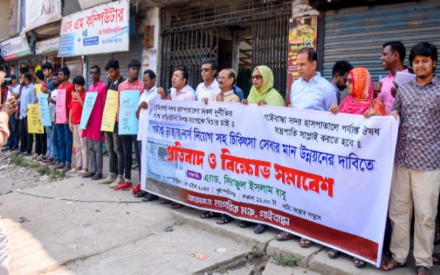 গাইবান্ধা জেলা সদর হাসপাতালে পর্যাপ্ত ডাক্তার, নার্স নিয়োগ এবং চিকিৎসাসেবার মান উন্নয়নের দাবিতে নাগরিক মঞ্চের আয়োজনে প্রতিবাদ ও বিক্ষোভ সমাবেশ অনুষ্ঠিত হয়। বৃহস্পতিবার গাইবান্ধা শহরের ডিবি রোডে অবস্থিত গাইবান্ধা নাট্য ও সাংস্কৃতিক সংস্থার (গানাসাস) সামনে এই কর্মসূচি অনুষ্ঠিত হয়েছে।