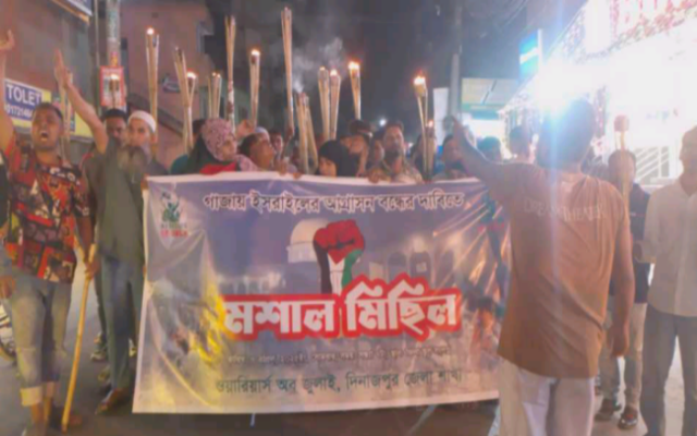 গাজায় ইসরায়েলের চলমান আগ্রাসন, নারী-শিশুসহ হাজারও নিরীহ মানুষের হত্যার প্রতিবাদে দিনাজপুরে মশাল মিছিল অনুষ্ঠিত হয়েছে।