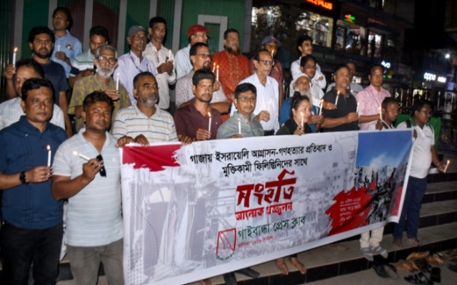 গাজায় ইসরায়েলি আগ্রাসন- বর্বর হত্যাযজ্ঞের প্রতিবাদ ও হত্যাযজ্ঞের শিকার অসংখ্য শিশু-নারী-পুরুষের প্রতি শ্রদ্ধা জানিয়ে আলোকপ্রজ্জ্বলন করে গণহত্যা বন্ধের জোর দাবি জানিয়েছেন গাইবান্ধার সাংবাদিকরা। গাইবান্ধা প্রেসক্লাবের উদ্যোগে বৃহস্পতিবার সন্ধ্যে ৬টায় প্রেসক্লাব চত্বর থেকে সাংবাদিকরা মোমবাতি প্রজ্জ্বলন করে শহরের বিভিন্ন সড়ক প্রদক্ষিণ করেন। পরে পৌর শহীদ মিনারের বেদিতে প্রজ্জ্বলিত মোমবাতি স্থাপন করা হয়।