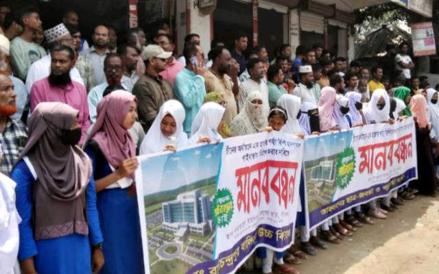 ‘রংপুর নয়, গাইবান্ধায় চাই চীনের ১০০০ শয্যার মৈত্রী হাসপাতাল’ ছাত্র-জনতার মুহুর্মুহু স্লোগানে মুখর হয়ে ওঠে গাইবান্ধা সদর উপজেলার বালুয়া বাজার এলাকা। বৃহস্পতিবার সকালে উপজেলার রামচন্দ্রপুর ইউনিয়নের বালুয়া বাজারে ‘ছাত্র-জনতা ও গাইবান্ধাবাসীর’ উদ্যোগে বিশাল মানববন্ধন ও সমাবেশ অনুষ্ঠিত হয়। নাকাইহাট রোডের বালুয়া বাজার এলাকায় তিন কিলোমিটারব্যাপী মানববন্ধনে ওই ইউনিয়নসহ আশেপাশের ইউনিয়নের বিভিন্ন শিক্ষা প্রতিষ্ঠানের শত শত ছাত্রছাত্রী, সাধারণ মানুষ, রাজনৈতিক দল ও বিভিন্ন সংগঠনের নেতাকর্মীরা অংশ নেন। মানববন্ধনের কারণে ওই রোডে ধীর গতিতে যানবাহন চলাচল করে।