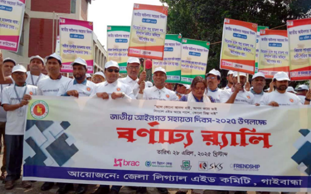 জাতীয় আইনগত সহায়তা দিবস উপলক্ষে গাইবান্ধা জেলা লিগ্যাল এইড কমিটির আয়োজনে সোমবার বর্ণাঢ্য র্যালি ও আলোচনা সভা অনুষ্ঠিত হয়। বর্ণাঢ্য র্যালিটি জজ কোট চত্বর থেকে বের হয়ে শহরের বিভিন্ন সড়ক প্রদক্ষিণ করে। র্যালির উদ্বোধন করেন জেলা লিগ্যাল এইড কমিটির চেয়ারম্যান এবং সিনিয়র জেলা ও দায়রা জজ মো. রেজাউল করিম সরকার।