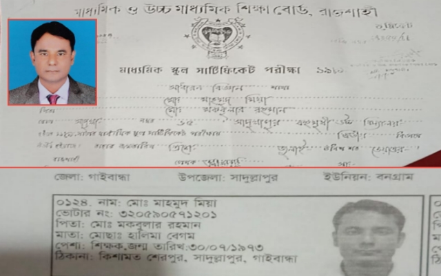 গাইবান্ধার সাদুল্লাপুর উপজেলার জয়েনপুর আদর্শ নিম্নমাধ্যমিক বিদ্যালয়ের প্রধান শিক্ষক মো. মাহমুদ মিয়ার বিরুদ্ধে ভয়াবহ বয়স জালিয়াতি, জাল কাগজপত্র তৈরি এবং দীর্ঘদিন ধরে রাষ্ট্রীয় অর্থ আত্মসাতের বিস্ফোরক অভিযোগ উঠেছে। অনুসন্ধানে বেরিয়ে এসেছে—চাকরির মেয়াদ অবৈধভাবে বাড়াতে তিনি পরিকল্পিতভাবে এসএসসি সার্টিফিকেট, ভোটার আইডি ও এমপিও শিটে ভিন্ন ভিন্ন জন্মতারিখ ব্যবহার করেছেন।