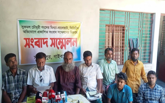 প্রতিবাদে গত ১৮-ই অক্টোবর শনিবার সুকমল চৌধুরী ওরফে গৌতম মেম্বার ও তার পরিবারের সদস্যদের নিয়ে গাইবান্ধার কাচারিবাজার গাইবান্ধা প্রেসক্লাবে সংবাদ সম্মেলন করে তারা হিন্দু সম্প্রদায় হওয়ায় তাদের সম্পত্তি জোর পূর্বক আমরা দখল করেছি বলে আমাদের বিরুদ্ধে জোর পূর্বক হিন্দু সম্প্রদায়ের পরিবারের সম্পত্তি দখলের অভিযোগ এনে সুকমল চৌধুরী ওরফে গৌতম মেম্বার ও তার পরিবারের সদস্যগণ প্রকৃত সত্য ঘটনাকে গোপন করে সাম্প্রদায়িকতা বিষয় এনে হিন্দু সম্প্রদায়ের পরিবারের লোকজন কে সামপ্রদায়িক ঘটনা বলে বুঝানোর চেষ্টা করে তাদের পক্ষে অবস্থান স্থানীয় পর্যায়ে সাম্প্রদায়িক দাঙ্গা সৃষ্টি করে মূলত তাদের অসৎ উদ্দেশ্য সফল করতেই সংবাদ সম্মেলন উপস্থিত সাংবাদিক ভাইদের সামনে মিথ্যা-বানোয়াট ভিত্তিহীন ভুল তথ্য উপস্থাপন করে হিন্দু সম্প্রদায়ের পরিবারের সম্পত্তি জোর পূর্বক দখল অভিযোগের তুলে তা প্রকাশিত করেছেন বলে উল্লেখ করে দাবী করে আয়োজিত সংবাদ সম্মেলনে উপস্থিত বিভিন্ন প্রিন্ট ও ইলেকট্রনিক মিডিয়ার সাংবাদিকদের সামনে সকলের অবগতির পরিবারের পক্ষে শামীম মিয়া লিখত বক্তব্য রাখেন।