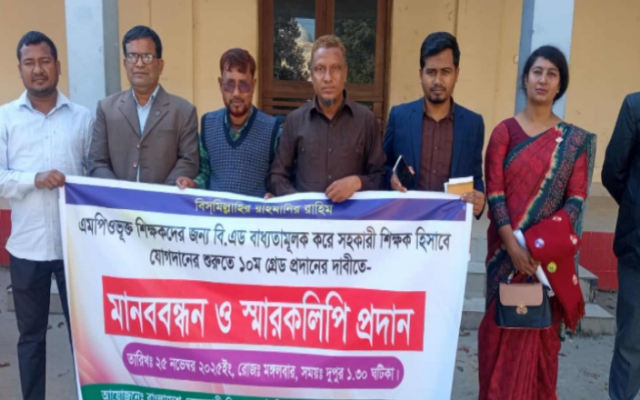 গাইবান্ধার গোবিন্দগঞ্জে বাংলাদেশ বেসরকারি শিক্ষক কর্মচারী ফোরামের (বাবেশিকফো) উদ্যোগে এমপিওভুক্ত শিক্ষক দের জন্য বিএড বাধ্যতামুলক করে সহকারী শিক্ষক হিসেবে যোগদানের শুরুতে ১০ম গ্রেত প্রদানের দাবীতে এক মানববন্ধন ও স্মারকলিপি প্রদান অনুষ্ঠিত হয়েছে।
