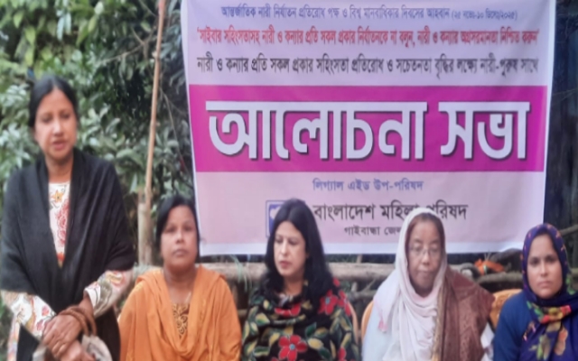 এ উপলক্ষে গাইবান্ধা পৌর শহরের দক্ষিণ ধানঘড়া এলাকায় রোববার বিকেলে তৃণমূলে নারী-পুরুষদের সাথে আলোচনা সভা অনুষ্ঠিত হয়। আলোচনা সভায় বক্তব্য রাখেন বাংলাদেশ মহিলা পরিষদ গাইবান্ধা জেলা শাখার সভাপতি মাহফুজা খানম মিতা, সাধারণ সম্পাদক রিকতু প্রসাদ, লিগ্যাল এইড সম্পাদক নিয়াজ আক্তার ইয়াসমিন, কার্যকরী সদস্য বিথী বেগম প্রমূখ।
