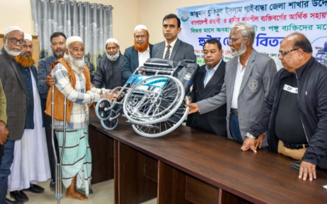 গাইবান্ধায় আঞ্জুমান মুফিদুল ইসলামের প্রতিবন্ধী ও পঙ্গু ব্যক্তিদের হুইল চেয়ার বিতরণ